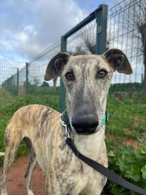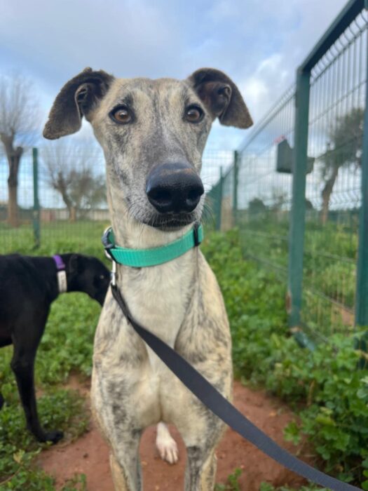 Fenicia wäre für Galgo Anfänger geeignet – sie wartet seit März 2025 bei der FBM auf ein Zuhause.